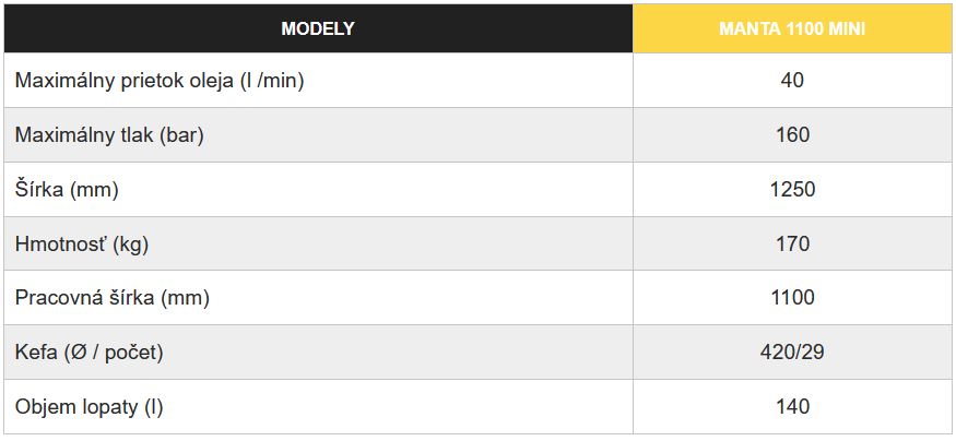 Metla so zberom MANTA MINI od U.EMME je špeciálne skonštruovaná, aby sa mohla používať ako prídavné zariadenie na malé šmykom riadené nakladače, malé kĺbové nakladače, minibagre a podobne. K štandardnému vybaveniu patria polypropylénové kefy, predné a bočné kryty s gumovými chráničmi a hadice s rýchlospojkami na hydraulický okruh.